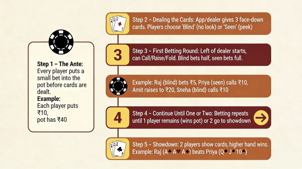 Let’s imagine a real game with 4 players: Raj, Priya, Amit, and Sneha. They all sit at a table on Teen Patti Master Plus.